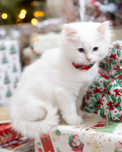 Carol is a magnificent Blue Eyed White! She is truly a regal Ragdoll cat in all her interactions with her kittens and our family. A sweet attentive mother and gentle purring companion. We love to look her directly in her pure blue eyes surrounded by her plush white fur coat!